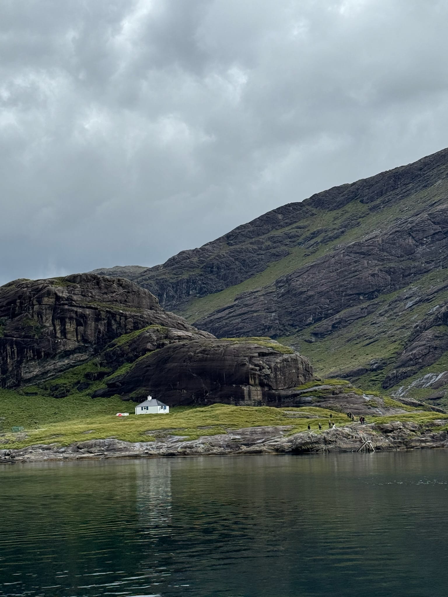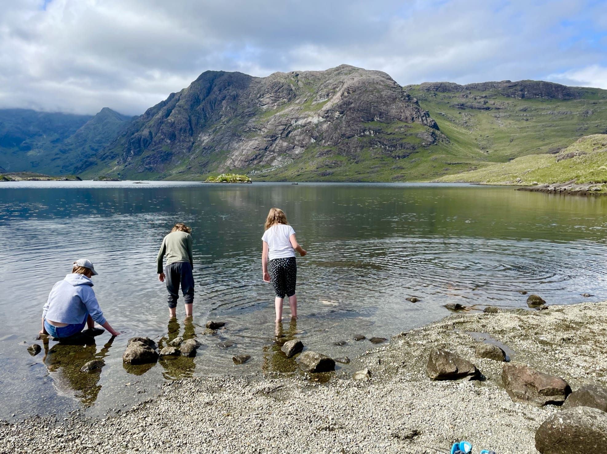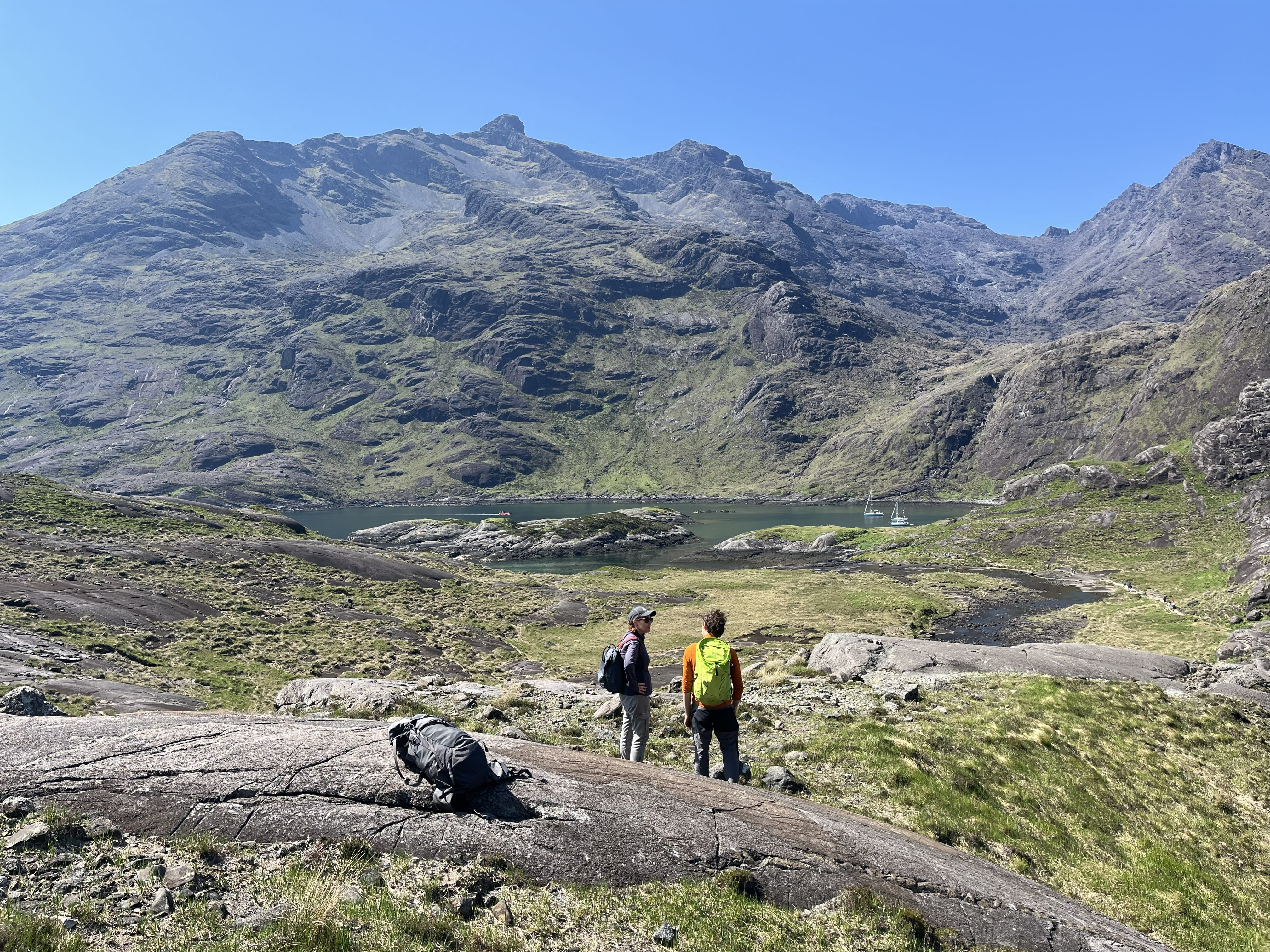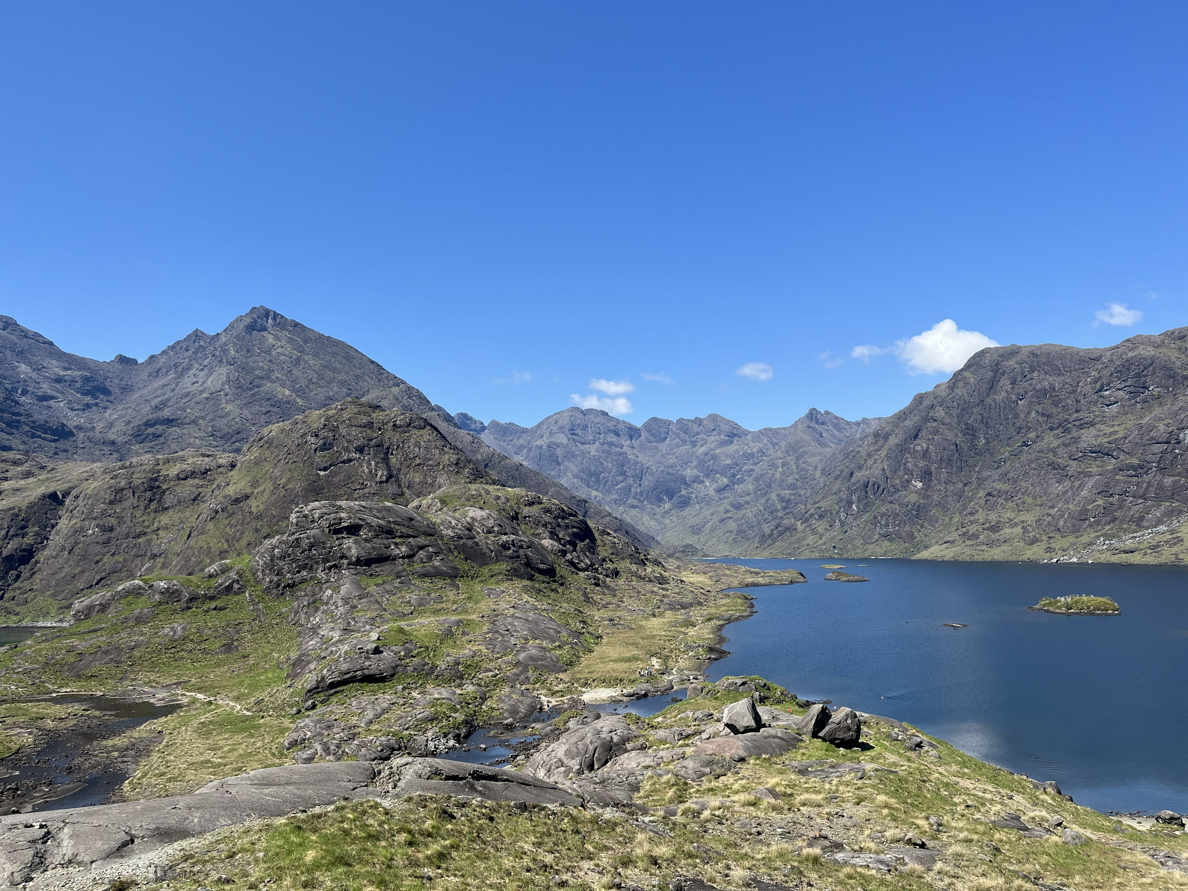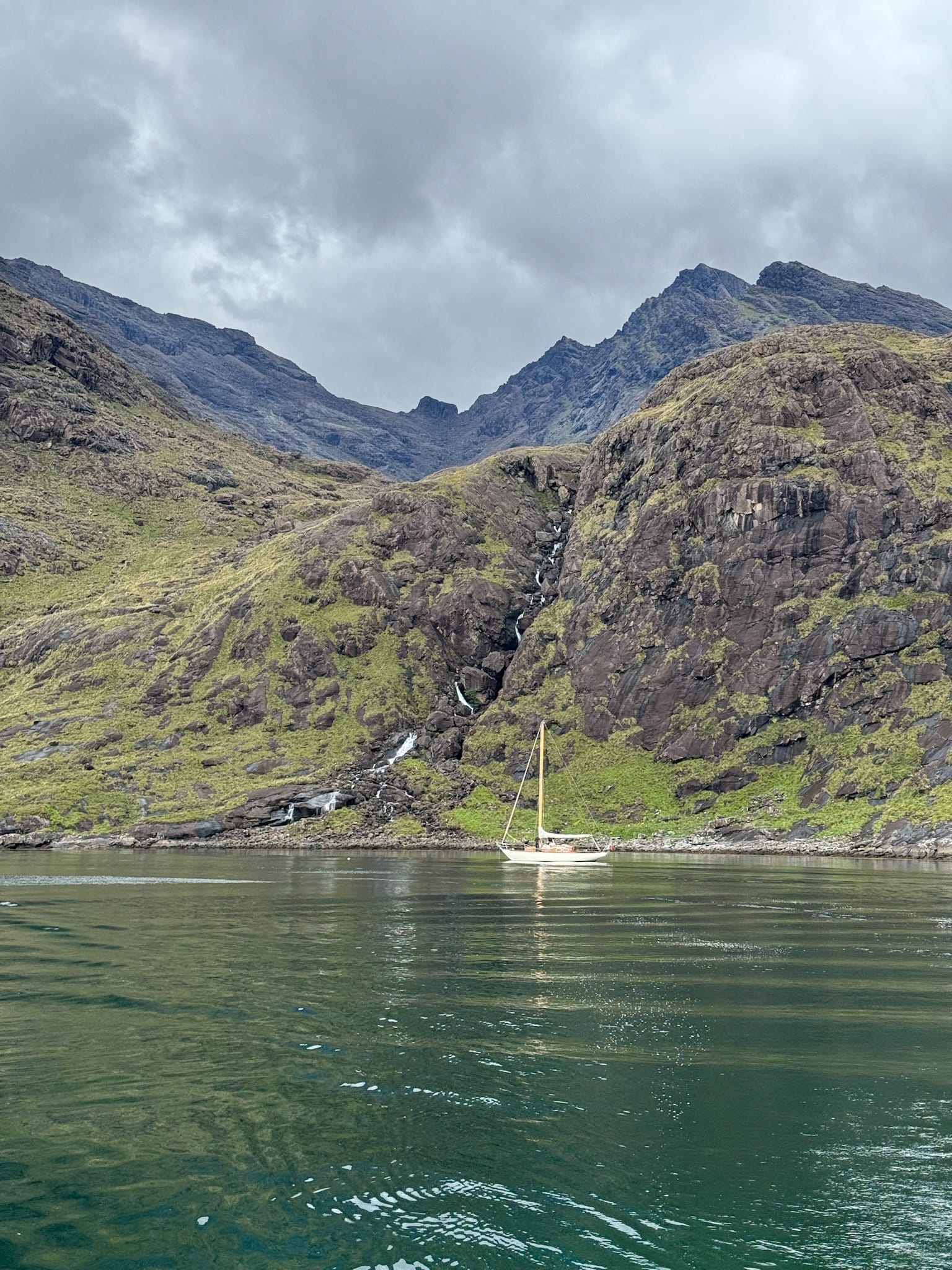 - The drama builds as you near the opposite shores of the sea loch. The mountains close in, steep and black, often streaked with waterfalls or wrapped in cloud. Then the boat slips into a small sheltered cove. The first sight of the loch is unforgettable. It sits encircled by the towering peaks of the Cuillin, forming a natural amphitheater of rock.
