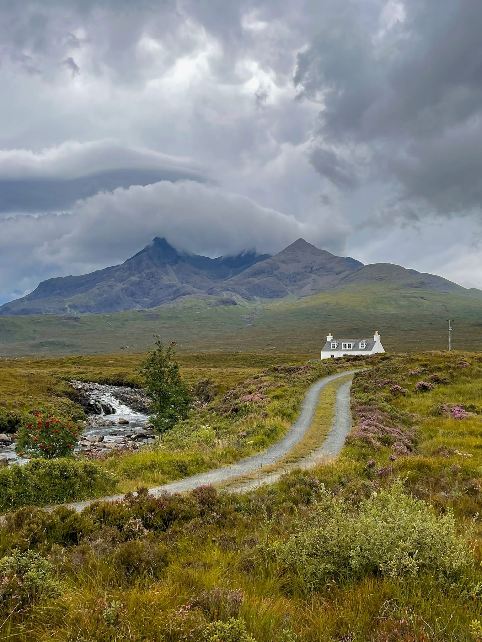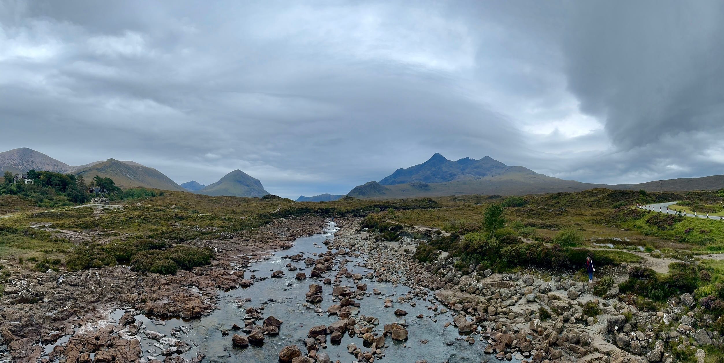 - We stop at Sligachan Old Bridge. At Sligachan you’re right at the heart of Skye’s most dramatic mountain scenery. Sligachan sits at the meeting point of glens, with the jagged skyline of the Black Cuillin rising sharply to the west and the softer Red Cuillin to the east. The old stone bridge is part of the old drovers road crossing the river Sligachan and is a perfect vantage point to see the mountain views.