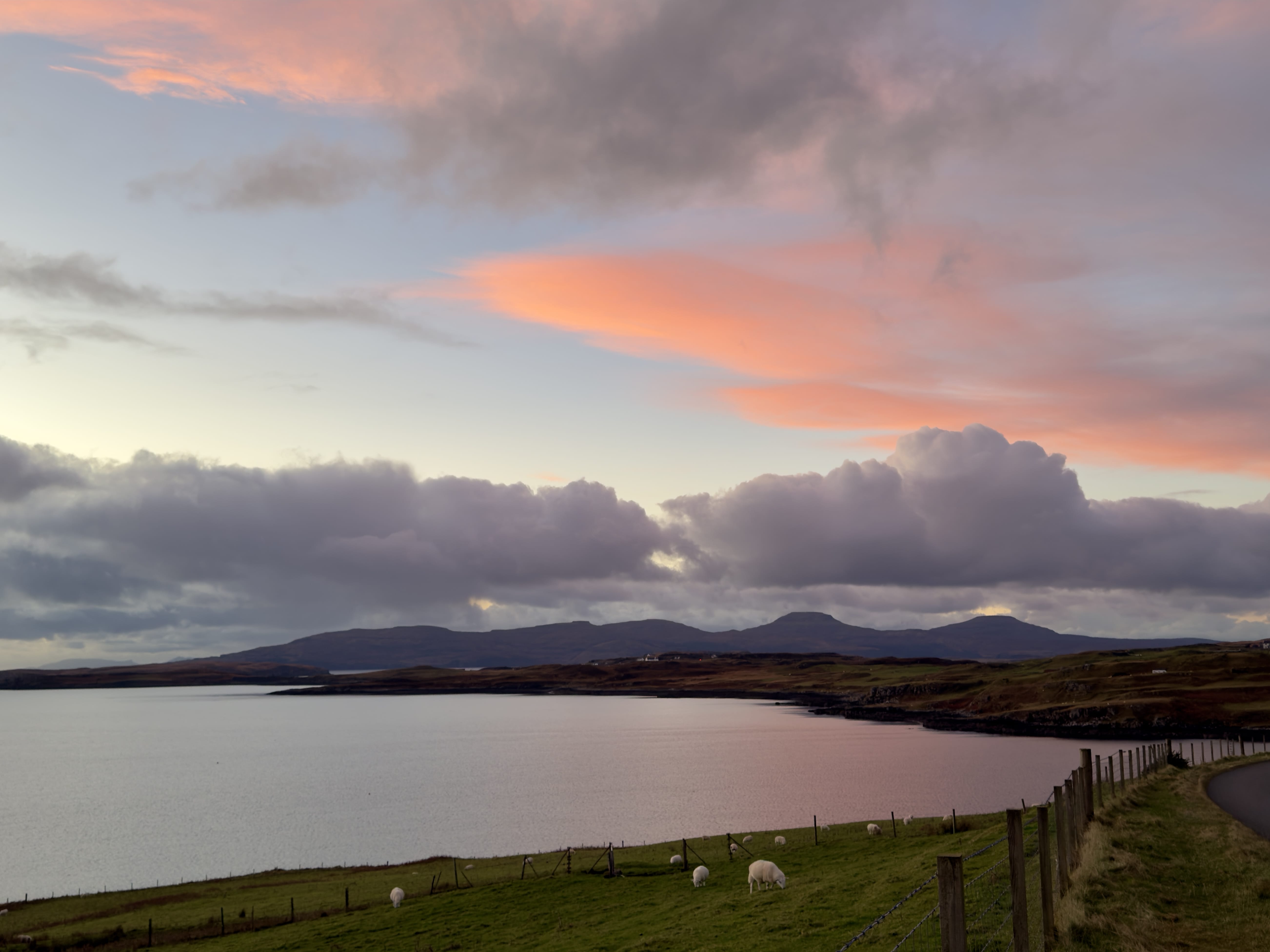 Then we travel down the west coast road to Loch Bracadale, and a dramatic panoramic view of the Cuillin mountains. The jagged 12 km ridge is all that remains of a 60 million year old super volcano.